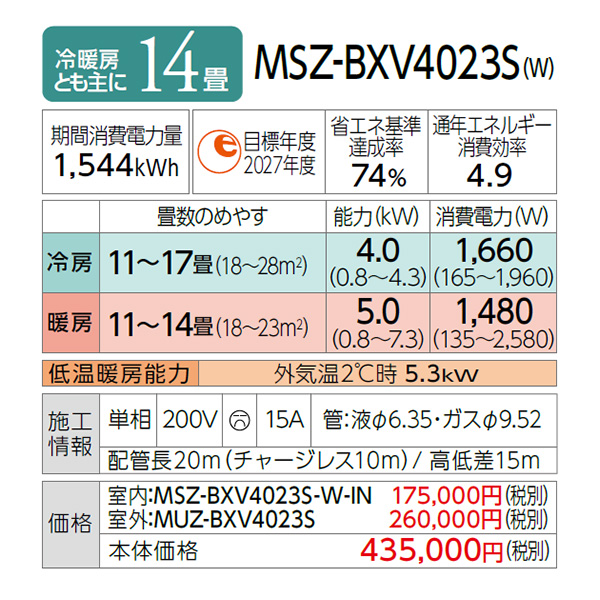 MSZ-BXV4023S-W 三菱電機 霧ヶ峰 ルームエアコン BXVシリーズ 14畳用 ピュアホワイト 2023年モデル ムーブアイ