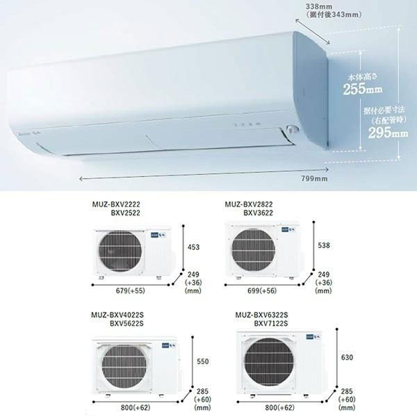 カテゴリ ルームエアコン 型番 MSZ-BXV6322S-W 定価 510,000円 販売価格 税込 197,000円 送料 東京・神奈川全域:無料(一部地域や離島を除く) 詳細 ■メーカー:三菱電機 ■モデル名:2022年モデル ■シリーズ名:霧ヶ峰 BXVシリーズ ■適用畳数:20畳用 ■カラー:ピュアホワイト ■電源:単相200V ■室内機:MSZ-BXV6322S-W ■室外機:MUZ-BXV6322S ●室内機サイズ:高255[据付必要寸法295]mm×幅799mm×奥行338(343)mm ●室外機サイズ:高630mm×幅800(+62)mm×奥行285(+60)mm ■期間消費電力量(年間):2383kWh ■その他機能等 ・ムーブアイ ・最高約60°C温風(BXV4022S~BXV7122S) ・STRONG冷房 ・スマート除湿 ・保湿風よけ ・ワイド気流 180° ・ロング気流 15m ・ハイパワー ・フィルターおそうじメカ(はずせる) ※記載された情報は商品仕様の一部ですので、詳細はメーカーサイトにてご確認ください。 ※標準取付工事のほか、家電量販店では対応困難な『隠ぺい配管工事』も承ります。