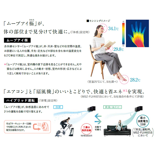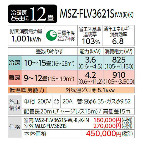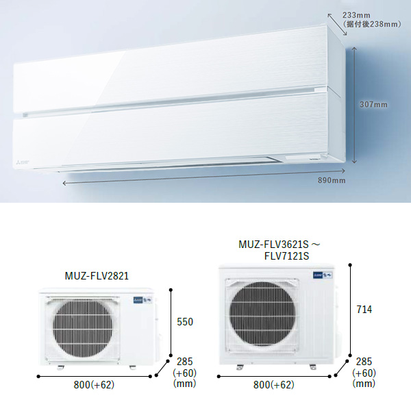カテゴリ ルームエアコン 型番 MSZ-FLV3621S-W 定価 450,000円 販売価格 税込 202,000円 送料 東京・神奈川全域:無料(一部地域や離島を除く) 詳細 ■メーカー:三菱電機 ■モデル名:2021年モデル ■シリーズ名:霧ヶ峰 FLシリーズ ■適用畳数:12畳用 ■カラー:パウダースノウ ■電源:単相200V ■室内機:MSZ-FLV3621S-W-IN ■室外機:MUZ-FLV3621S ●室内機サイズ:高さ307mm×幅890mm×奥行233(据付後238)mm ●室外機サイズ:高さ714mm×幅800(+62)mm×奥行285(+60)mm ■期間消費電力量(年間):1001kWh ■その他機能等 ・ムーブアイ極 ・ハイブリッド運転(冷房・爽風 / 暖房・サーキュレーター) ・室温キープシステム ・スマート除湿 ・急速Wヒート ・STRONG冷房 ・保湿風よけ ・内部クリーン(スタート脱臭) ・2ヶ所同時空調 ※記載された情報は商品仕様の一部ですので、詳細はメーカーサイトにてご確認ください。 ※標準取付工事のほか、家電量販店では対応困難な『隠ぺい配管工事』も承ります。