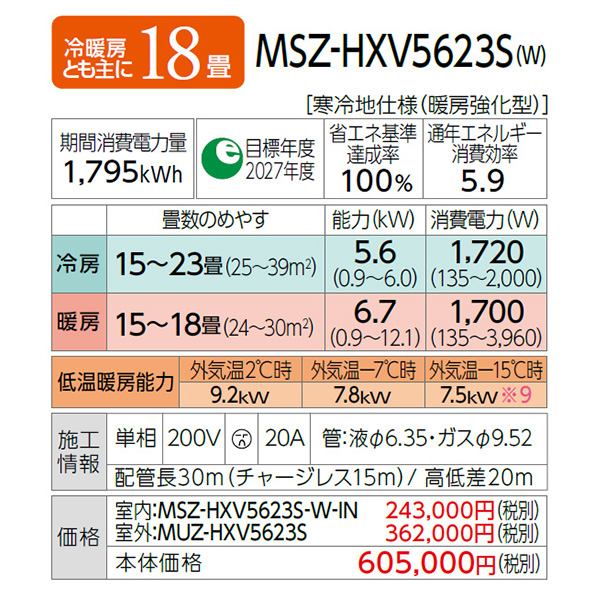 カテゴリ ルームエアコン 型番 MSZ-HXV5623S-W 定価 605,000円 販売価格 税込 281,000円 送料 東京・神奈川全域:無料(一部地域や離島を除く) 詳細 ■メーカー:三菱電機 ■モデル名:2023年モデル ■シリーズ名:霧ヶ峰 ズバ暖 HXVシリーズ ■適用畳数:18畳用 ■カラー:ピュアホワイト ■電源:単相200V ■室内機:MSZ-HXV5623S-W-IN ■室外機:MUZ-HXV5623S ●室内機サイズ:高さ285mm×幅890mm×奥行358(据付後363)mm ●室外機サイズ:高さ714mm×幅800(+62)mm×奥行285(+60)mm ■期間消費電力量(年間):1795kWh ■その他機能等 ・寒冷地仕様 ・ムーブアイmirA.I.+ ・ピュアミスト ・おまかせ:AI自動 ・ハイブリッド運転:AI ・窓からの冷気対策:AI ・快適ノンストップ暖房 ・高温みまもり ・さらっと除湿冷房 ※記載された情報は商品仕様の一部ですので、詳細はメーカーサイトにてご確認ください。 ※標準取付工事のほか、家電量販店では対応困難な『隠ぺい配管工事』も承ります。