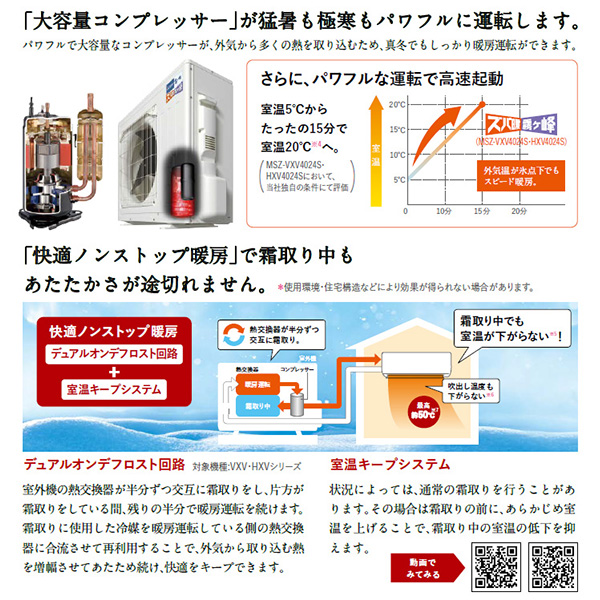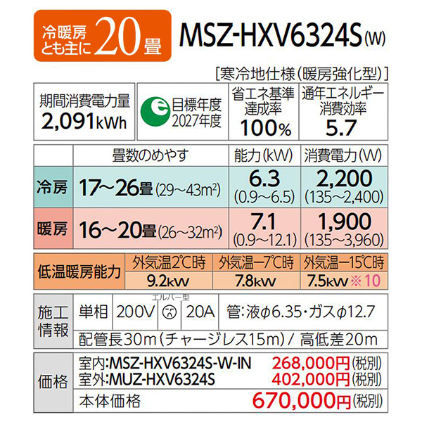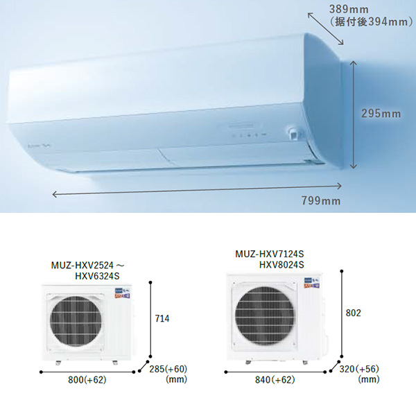 カテゴリ ルームエアコン 型番 MSZ-HXV6324S-W 定価 670,000円 販売価格 税込 272,800円 送料 東京・神奈川全域:無料(一部地域や離島を除く) 詳細 ■メーカー:三菱電機 ■モデル名:2024年モデル ■シリーズ名:霧ヶ峰 ズバ暖 HXVシリーズ ■適用畳数:20畳用 ■カラー:ピュアホワイト ■電源:単相200V ■室内機:MSZ-HXV6324S-W-IN ■室外機:MUZ-HXV6324S ●室内機サイズ:高さ295mm×幅799mm×奥行389(据付後394)mm ●室外機サイズ:高さ714mm×幅800(+62)mm×奥行285(+60)mm ■期間消費電力量(年間):2091kWh ■その他機能等 ・寒冷地仕様 ・エモコアイ ・ムーブアイmirA.I.+ ・A.I.自動 ・A.I.(ハイブリッド運転) ・A.I.(自動風あて・風よけ) ・ピュアミスト/ヘルスエアー機能 ・さらっと除湿冷房 ・フィルター自動お掃除(はずせる) ・暖房強化プレミアムモデル ※記載された情報は商品仕様の一部ですので、詳細はメーカーサイトにてご確認ください。 ※標準取付工事のほか、家電量販店では対応困難な『隠ぺい配管工事』も承ります。