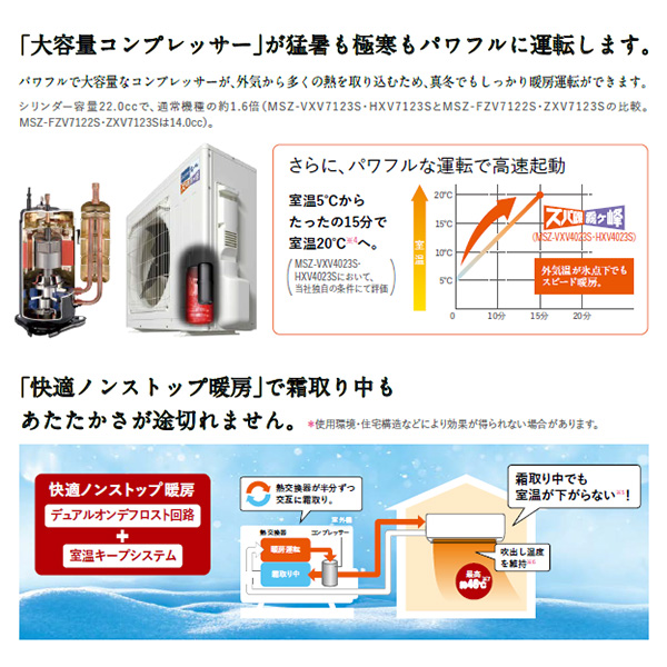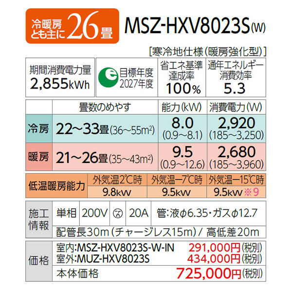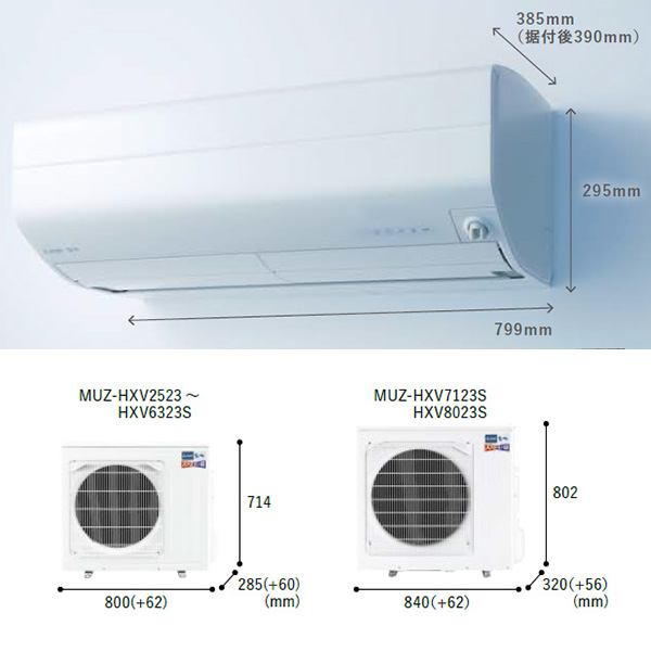 カテゴリ ルームエアコン 型番 MSZ-HXV8023S-W 定価 725,000円 販売価格 税込 336,000円 送料 東京・神奈川全域:無料(一部地域や離島を除く) 詳細 ■メーカー:三菱電機 ■モデル名:2023年モデル ■シリーズ名:霧ヶ峰 ズバ暖 HXVシリーズ ■適用畳数:26畳用 ■カラー:ピュアホワイト ■電源:単相200V ■室内機:MSZ-HXV8023S-W-IN ■室外機:MUZ-HXV8023S ●室内機サイズ:高さ295mm×幅799mm×奥行385(据付後390)mm ●室外機サイズ:高さ802mm×幅840(+62)mm×奥行320(+56)mm ■期間消費電力量(年間):2855kWh ■その他機能等 ・寒冷地仕様 ・ムーブアイmirA.I.+ ・ピュアミスト ・おまかせ:AI自動 ・ハイブリッド運転:AI ・窓からの冷気対策:AI ・快適ノンストップ暖房 ・高温みまもり ・さらっと除湿冷房 ※記載された情報は商品仕様の一部ですので、詳細はメーカーサイトにてご確認ください。 ※標準取付工事のほか、家電量販店では対応困難な『隠ぺい配管工事』も承ります。