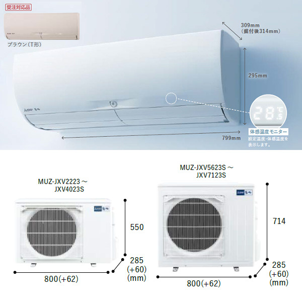 カテゴリ ルームエアコン 型番 MSZ-JXV2823S-T 定価 380,000円 販売価格 税込 159,000円 送料 東京・神奈川全域:無料(一部地域や離島を除く) 詳細 ■メーカー:三菱電機 ■モデル名:2023年モデル ■シリーズ名:霧ヶ峰 JXVシリーズ ■適用畳数:10畳用 ■カラー:ブラウン ■電源:単相200V ■室内機:MSZ-JXV2823S-T-IN ■室外機:MUZ-JXV2823S ●室内機サイズ:高さ295mm×幅799mm×奥行389(据付後394)mm ●室外機サイズ:高さ550mm×幅800(+62)mm×奥行285(+60)mm ■期間消費電力量(年間):790kWh ■その他機能等 ・ムーブアイ ・ハイブリッド運転 ・室温キープシステム ・さらっと除湿冷房 ・STRONG冷房 ・急速Wヒート ・ピュアミスト ・内部クリーン・スタート脱臭 ・フィルターおそうじメカ ※記載された情報は商品仕様の一部ですので、詳細はメーカーサイトにてご確認ください。 ※標準取付工事のほか、家電量販店では対応困難な『隠ぺい配管工事』も承ります。