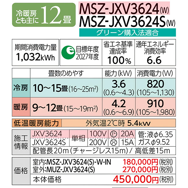 カテゴリ ルームエアコン 型番 MSZ-JXV3624-W 定価 450,000円 販売価格 税込 195,000円 送料 東京・神奈川全域:無料(一部地域や離島を除く) 詳細 ■メーカー:三菱電機 ■モデル名:2024年モデル ■シリーズ名:霧ヶ峰 JXVシリーズ ■適用畳数:12畳用 ■カラー:ピュアホワイト ■電源:単相100V ■室内機:MSZ-JXV3624-W-IN ■室外機:MUZ-JXV3624 ●室内機サイズ:高さ295mm×幅799mm×奥行389(据付後394)mm ●室外機サイズ:高さ550mm×幅800(+62)mm×奥行285(+60)mm ■期間消費電力量(年間):1032kWh ■その他機能等 ・ムーブアイ ・ハイブリッド運転 ・ピュアミスト ・さらっと除湿冷房 ・保湿風よけ ・室温キープシステム ・フィルター自動お掃除(はずせる) ・内部クリーン / スタート脱臭 ・匠フラップ ※記載された情報は商品仕様の一部ですので、詳細はメーカーサイトにてご確認ください。 ※標準取付工事のほか、家電量販店では対応困難な『隠ぺい配管工事』も承ります。