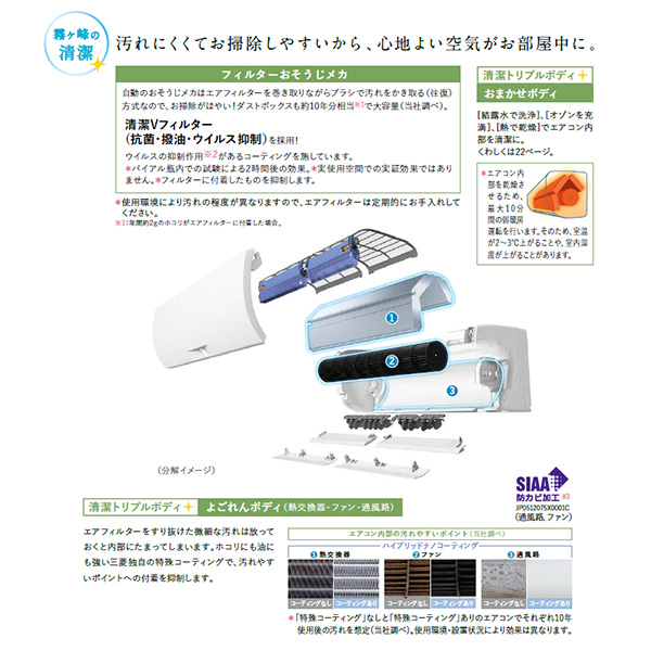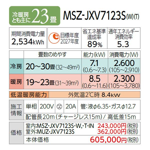カテゴリ ルームエアコン 型番 MSZ-JXV7123S-T 定価 605,000円 販売価格 税込 252,000円 送料 東京・神奈川全域:無料(一部地域や離島を除く) 詳細 ■メーカー:三菱電機 ■モデル名:2023年モデル ■シリーズ名:霧ヶ峰 JXVシリーズ ■適用畳数:23畳用 ■カラー:ブラウン ■電源:単相200V ■室内機:MSZ-JXV7123S-T-IN ■室外機:MUZ-JXV7123S ●室内機サイズ:高さ295mm×幅799mm×奥行309(据付後314)mm ●室外機サイズ:高さ714mm×幅800(+62)mm×奥行285(+60)mm ■期間消費電力量(年間):2534kWh ■その他機能等 ・ムーブアイ ・ハイブリッド運転 ・室温キープシステム ・さらっと除湿冷房 ・STRONG冷房 ・急速Wヒート ・ピュアミスト ・内部クリーン・スタート脱臭 ・フィルターおそうじメカ ※記載された情報は商品仕様の一部ですので、詳細はメーカーサイトにてご確認ください。 ※標準取付工事のほか、家電量販店では対応困難な『隠ぺい配管工事』も承ります。