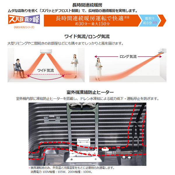 カテゴリ ルームエアコン 型番 MSZ-KXV2824-W 定価 340,000円 販売価格 税込 132,000円 送料 東京・神奈川全域:無料(一部地域や離島を除く) 詳細 ■メーカー:三菱電機 ■モデル名:2024年モデル ■シリーズ名:霧ヶ峰 ズバ暖 KXVシリーズ ■適用畳数:10畳用 ■カラー:ピュアホワイト ■電源:単相100V ■室内機:MSZ-KXV2824-W-IN ■室外機:MUZ-KXV2824 ●室内機サイズ:高さ295mm×幅799mm×奥行230(据付後235)mm ●室外機サイズ:高さ550mm×幅800(+62)mm×奥行285(+60)mm ■期間消費電力量(年間):854kWh ■その他機能等 ・寒冷地仕様 ・ムーブアイ ・ハイブリッド運転 ・室温キープシステム ・長時間連続暖房 ・スマート除湿 ・保湿風よけ ・プラチナアレル除菌空清フィルター ・内部クリーンlight/スタート脱臭 ・暖房能力強化モデル ※記載された情報は商品仕様の一部ですので、詳細はメーカーサイトにてご確認ください。 ※標準取付工事のほか、家電量販店では対応困難な『隠ぺい配管工事』も承ります。