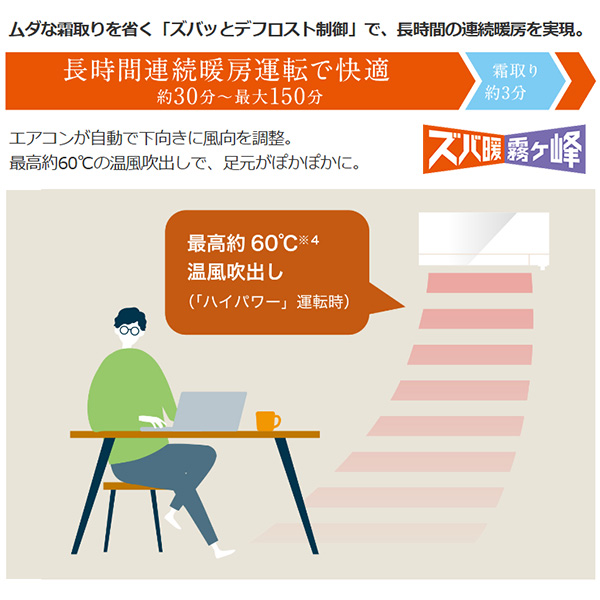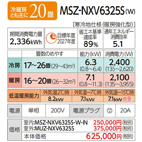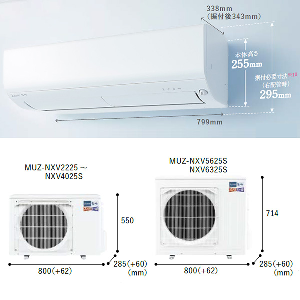 カテゴリ ルームエアコン 型番 MSZ-NXV6325S-W 定価 625,000円 販売価格 税込 308,000円 送料 東京・神奈川全域:無料(一部地域や離島を除く) 詳細 ■メーカー:三菱電機 ■モデル名:2025年モデル ■シリーズ名:霧ヶ峰 ズバ暖 NXVシリーズ ■適用畳数:20畳用 ■カラー:ピュアホワイト ■電源:単相200V ■室内機:MSZ-NXV6325S-W-IN ■室外機:MUZ-NXV6325S ●室内機サイズ:高さ255mm(据付必要寸法/右配管時295mm)×幅799mm×奥行338(据付後343)mm ●室外機サイズ:高さ714mm×幅800(+62)mm×奥行285(+60)mm ■期間消費電力量(年間):2336kWh ■その他機能等 ・寒冷地仕様 ・ムーブアイ ・ハイブリッド運転 ・室温キープシステム ・長時間連続暖房 ・スマート除湿 ・ヘルスエアー機能 ・フィルター自動お掃除(はずせる) ・暖房能力強化 高さコンパクトモデル ※記載された情報は商品仕様の一部ですので、詳細はメーカーサイトにてご確認ください。 ※標準取付工事のほか、家電量販店では対応困難な『隠ぺい配管工事』も承ります。