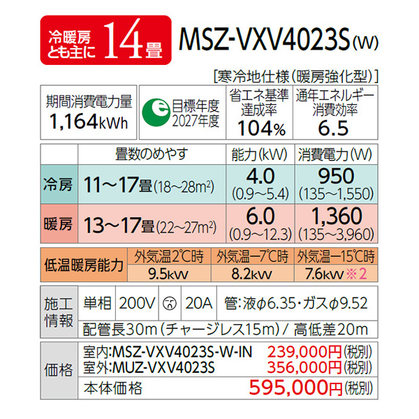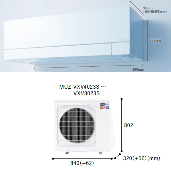 カテゴリ ルームエアコン 型番 MSZ-VXV4023S-W 定価 595,000円 販売価格 税込 290,000円 送料 東京・神奈川全域:無料(一部地域や離島を除く) 詳細 ■メーカー:三菱電機 ■モデル名:2023年モデル ■シリーズ名:霧ヶ峰 ズバ暖 VXVシリーズ ■適用畳数:14畳用 ■カラー:ピュアホワイト ■電源:単相200V ■室内機:MSZ-VXV4023S-W-IN ■室外機:MUZ-VXV4023S ●室内機サイズ:高さ285mm×幅890mm×奥行358(据付後363)mm ●室外機サイズ:高さ802mm×幅840(+62)mm×奥行320(+56)mm ■期間消費電力量(年間):1164kWh ■その他機能等 ・寒冷地仕様 ・ムーブアイmirA.I.+ ・ピュアミスト ・おまかせ:AI自動 ・ハイブリッド運転:AI ・窓からの冷気対策:AI ・快適ノンストップ暖房 ・高温みまもり ・プレミアム除湿 ※記載された情報は商品仕様の一部ですので、詳細はメーカーサイトにてご確認ください。 ※標準取付工事のほか、家電量販店では対応困難な『隠ぺい配管工事』も承ります。