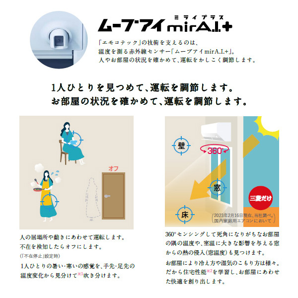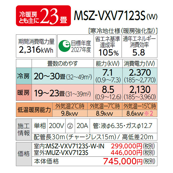 カテゴリ ルームエアコン 型番 MSZ-VXV7123S-W 定価 745,000円 販売価格 税込 362,000円 送料 東京・神奈川全域:無料(一部地域や離島を除く) 詳細 ■メーカー:三菱電機 ■モデル名:2023年モデル ■シリーズ名:霧ヶ峰 ズバ暖 VXVシリーズ ■適用畳数:23畳用 ■カラー:ピュアホワイト ■電源:単相200V ■室内機:MSZ-VXV7123S-W-IN ■室外機:MUZ-VXV7123S ●室内機サイズ:高さ285mm×幅890mm×奥行358(据付後363)mm ●室外機サイズ:高さ802mm×幅840(+62)mm×奥行320(+56)mm ■期間消費電力量(年間):2316kWh ■その他機能等 ・寒冷地仕様 ・ムーブアイmirA.I.+ ・ピュアミスト ・おまかせ:AI自動 ・ハイブリッド運転:AI ・窓からの冷気対策:AI ・快適ノンストップ暖房 ・高温みまもり ・プレミアム除湿 ※記載された情報は商品仕様の一部ですので、詳細はメーカーサイトにてご確認ください。 ※標準取付工事のほか、家電量販店では対応困難な『隠ぺい配管工事』も承ります。