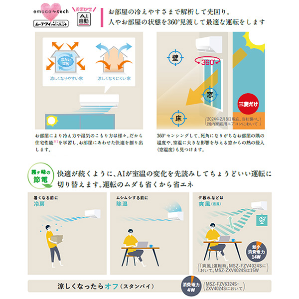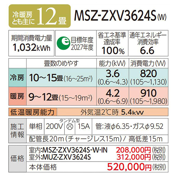 カテゴリ ルームエアコン 型番 MSZ-ZXV3624S-W 定価 520,000円 販売価格 税込 172,700円 送料 東京・神奈川全域:無料(一部地域や離島を除く) 詳細 ■メーカー:三菱電機 ■モデル名:2024年モデル ■シリーズ名:霧ヶ峰 Zシリーズ ■適用畳数:12畳用 ■カラー:ピュアホワイト ■電源:単相200V ■室内機:MSZ-ZXV3624S-W-IN ■室外機:MUZ-ZXV3624S ●室内機サイズ:高さ295mm×幅799mm×奥行389(据付後394)mm ●室外機サイズ:高さ550mm×幅800(+62)mm×奥行285(+60)mm ■期間消費電力量(年間):1032kWh ■その他機能等 ・エモコアイ ・ムーブアイmirA.I.+ ・A.I.自動 ・A.I.(ハイブリッド運転) ・A.I.(自動風あて・風よけ) ・ピュアミスト ・さらっと除湿冷房 ・フィルター自動お掃除(はずせる) ・保湿風よけ ※記載された情報は商品仕様の一部ですので、詳細はメーカーサイトにてご確認ください。 ※標準取付工事のほか、家電量販店では対応困難な『隠ぺい配管工事』も承ります。