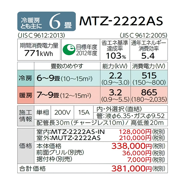 カテゴリ ハウジングエアコン 型番 MTZ-2222AS 定価 381,000円 販売価格 税込 121,000円 送料 東京・神奈川全域:無料(一部地域や離島を除く) 詳細 ■メーカー:三菱電機 ■モデル名:2022年モデル ■タイプ名:壁埋込形 ■シリーズ名:霧ヶ峰 ■適用畳数:6畳用 ■電源:単相200V ■室内機:MTZ-2222AS-IN ■室外機:MUTZ-2222AS ●室内機サイズ:高さ325mm×幅748mm×奥行181mm ●室外機サイズ:高さ550mm×幅800(+62)mm×奥行285(+60)mm ■期間消費電力量(年間):kWh ■その他機能等 ・STRONG冷房 ・選べる3モード除湿 ・室温キープシステム ・高天井モード ・高温みまもり ・オートフラップ(前面グリル) ・上下涼感スイング ・ハイパワー ・プラチナエアフィルター ※記載された情報は商品仕様の一部ですので、詳細はメーカーサイトにてご確認ください。 ※標準取付工事のほか、家電量販店では対応困難な『隠ぺい配管工事』も承ります。