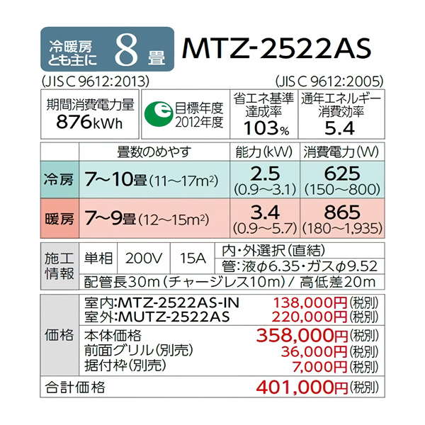 カテゴリ ハウジングエアコン 型番 MTZ-2522AS 定価 401,000円 販売価格 税込 128,000円 送料 東京・神奈川全域:無料(一部地域や離島を除く) 詳細 ■メーカー:三菱電機 ■モデル名:2022年モデル ■タイプ名:壁埋込形 ■シリーズ名:霧ヶ峰 ■適用畳数:8畳用 ■電源:単相200V ■室内機:MTZ-2522AS-IN ■室外機:MUTZ-2522AS ●室内機サイズ:高さ325mm×幅748mm×奥行181mm ●室外機サイズ:高さ550mm×幅800(+62)mm×奥行285(+60)mm ■期間消費電力量(年間):kWh ■その他機能等 ・STRONG冷房 ・選べる3モード除湿 ・室温キープシステム ・高天井モード ・高温みまもり ・オートフラップ(前面グリル) ・上下涼感スイング ・ハイパワー ・プラチナエアフィルター ※記載された情報は商品仕様の一部ですので、詳細はメーカーサイトにてご確認ください。 ※標準取付工事のほか、家電量販店では対応困難な『隠ぺい配管工事』も承ります。