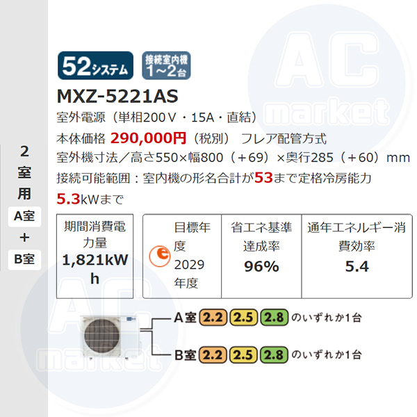 カテゴリ ハウジングエアコン 型番 MXZ-5221AS(室外機のみ) 定価 290,000円 販売価格 税込 93,000円 送料 東京・神奈川全域:無料(一部地域や離島を除く) 詳細 ■メーカー:三菱電機 ■モデル名:2021年モデル ■システムマルチエアコン(室外機) ■室内機合計能力:5.3KWまで ■対応室数:2室用 ■電源:単相200V ■室内機:なし ■室外機:MXZ-5221AS ●室内機サイズ:- ●室外機サイズ:高さ550mm×幅800(+69)mm×奥行285(+60)mm ■期間消費電力量(年間):1821kWh ■その他機能等 ・室外電源 ・52システム ・フレア配管方式 ※記載された情報は商品仕様の一部ですので、詳細はメーカーサイトにてご確認ください。 ※標準取付工事のほか、家電量販店では対応困難な『隠ぺい配管工事』も承ります。