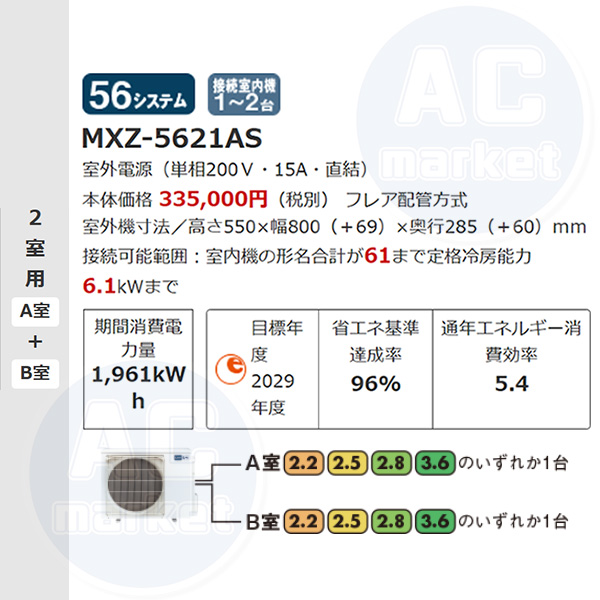 カテゴリ ハウジングエアコン 型番 MXZ-5621AS(室外機のみ) 定価 335,000円 販売価格 税込 107,000円 送料 東京・神奈川全域:無料(一部地域や離島を除く) 詳細 ■メーカー:三菱電機 ■モデル名:2021年モデル ■タイプ名:システムマルチエアコン(室外機) ■室内機合計能力:6.1KWまで ■対応室数:2室用 ■電源:単相200V ■室内機:なし ■室外機:MXZ-5621AS ●室内機サイズ:- ●室外機サイズ:高さ550mm×幅800(+69)mm×奥行285(+60)mm ■期間消費電力量(年間):1961kWh ■その他機能等 ・室外電源 ・56システム ・フレア配管方式 ※記載された情報は商品仕様の一部ですので、詳細はメーカーサイトにてご確認ください。 ※標準取付工事のほか、家電量販店では対応困難な『隠ぺい配管工事』も承ります。