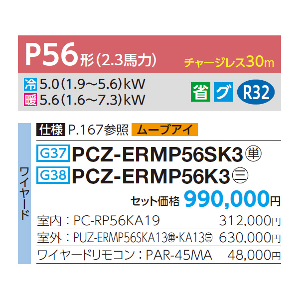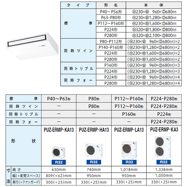 カテゴリ 業務用エアコン 型番 PCZ-ERMP56SK3 / PCZ-ERMP56K3 定価 1,089,000円 販売価格 税込 229,000円 送料 東京・神奈川全域:無料(一部地域や離島を除く) 詳細 ■メーカー:三菱電機 ■モデル名:2023年モデル ■タイプ名:パッケージエアコン / 天井吊り形1方向 / スリムER / シングル(室内機1台×室外機1台) ■能力:2.3馬力(P56形) /【平米数】33~49㎡ /【坪数】10~14坪 /【畳数】20~28畳 ■電源:単相200V / 三相200V ■室内機:PC-RP56KA19 ■室外機:PUZ-ERMP56SKA13 / PUZ-ERMP56KA13 ●室内機サイズ:高さ230mm×幅960mm×奥行680mm ●室外機サイズ:高630mm×幅809(+62)mm×奥行300(+23)mm ■通年エネルギー消費効率:5 ■その他機能等 ・ワイヤード ・ムーブアイ ・冷暖自動運転 ・ドライ運転 ・ハイパワー運転 ・風速自動 ・風速ノッチ4 ・暖房プレヒート ・ホットスタート ※記載された情報は商品仕様の一部ですので、詳細はメーカーサイトにてご確認ください。 ※標準取付工事のほか、家電量販店では対応困難な『隠ぺい配管工事』も承ります。
