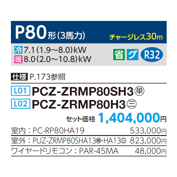 カテゴリ 業務用エアコン 型番 PCZ-ZRMP80SH3 / PCZ-ZRMP80H3 定価 1,544,400円 販売価格 税込 347,000円 送料 東京・神奈川全域:無料(一部地域や離島を除く) 詳細 ■メーカー:三菱電機 ■モデル名:2023年モデル ■タイプ名:パッケージエアコン / 厨房用 / スリムZR / シングル(室内機1台×室外機1台) ■能力:3馬力(P80形) /【平米数】47~70㎡ /【坪数】14~21坪 /【畳数】28~42畳 ■電源:単相200V / 三相200V ■室内機:PC-RP80HA19 ■室外機:PUZ-ZRMP80SHA13 / PUZ-ZRMP80HA13 ●室内機サイズ:高さ280(+32)mm×幅1136mm×奥行650mm ●室外機サイズ:高943mm×幅950mm×奥行330(+25)mm ■通年エネルギー消費効率:5.1 ■その他機能等 ・ワイヤード ・冷暖自動運転 ・ドライ運転 ・ハイパワー運転 ・上下/左右風向切換(手動) ・暖房プレヒート ・ホットスタート ・サーモオフ時霜取り ・パワーシェア運転 ※記載された情報は商品仕様の一部ですので、詳細はメーカーサイトにてご確認ください。 ※標準取付工事のほか、家電量販店では対応困難な『隠ぺい配管工事』も承ります。