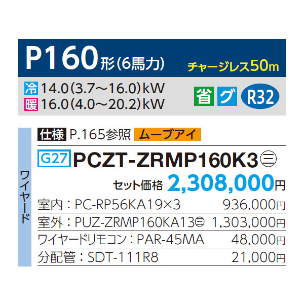 カテゴリ 業務用エアコン 型番 PCZT-ZRMP160K3 定価 2,538,800円 販売価格 税込 569,000円 送料 東京・神奈川全域:無料(一部地域や離島を除く) 詳細 ■メーカー:三菱電機 ■モデル名:2023年モデル ■タイプ名:パッケージエアコン / 天井吊り形1方向 / スリムZR / トリプル(室内機3台×室外機1台) ■能力:6馬力(P160形) /【平米数】94~139㎡ /【坪数】28~42坪 /【畳数】56~84畳 ■電源:三相200V ■室内機:PC-RP56KA19 x3 ■室外機:PUZ-ZRMP160KA13 ●室内機サイズ:高さ230mm×幅960mm×奥行680mm ●室外機サイズ:高1338mm×幅1050mm×奥行330(+25)mm ■通年エネルギー消費効率:5.7 ■その他機能等 ・ワイヤード ・ムーブアイ ・冷暖自動運転 ・ドライ運転 ・ハイパワー運転 ・風速自動 ・風速ノッチ4 ・暖房プレヒート ・ホットスタート ※記載された情報は商品仕様の一部ですので、詳細はメーカーサイトにてご確認ください。 ※標準取付工事のほか、家電量販店では対応困難な『隠ぺい配管工事』も承ります。