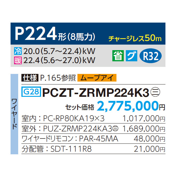 カテゴリ 業務用エアコン 型番 PCZT-ZRMP224K3 定価 3,052,500円 販売価格 税込 685,000円 送料 東京・神奈川全域:無料(一部地域や離島を除く) 詳細 ■メーカー:三菱電機 ■モデル名:2023年モデル ■タイプ名:パッケージエアコン / 天井吊り形1方向 / スリムZR / トリプル(室内機3台×室外機1台) ■能力:8馬力(P224形) /【平米数】132~195㎡ /【坪数】40~59坪 /【畳数】80~118畳 ■電源:三相200V ■室内機:PC-RP80KA19 x3 ■室外機:PUZ-ZRMP224KA3 ●室内機サイズ:高さ230mm×幅1280mm×奥行680mm ●室外機サイズ:高1338mm×幅1050mm×奥行330(+25)mm ■通年エネルギー消費効率:5.3 ■その他機能等 ・ワイヤード ・ムーブアイ ・冷暖自動運転 ・ドライ運転 ・ハイパワー運転 ・風速自動 ・風速ノッチ4 ・暖房プレヒート ・ホットスタート ※記載された情報は商品仕様の一部ですので、詳細はメーカーサイトにてご確認ください。 ※標準取付工事のほか、家電量販店では対応困難な『隠ぺい配管工事』も承ります。