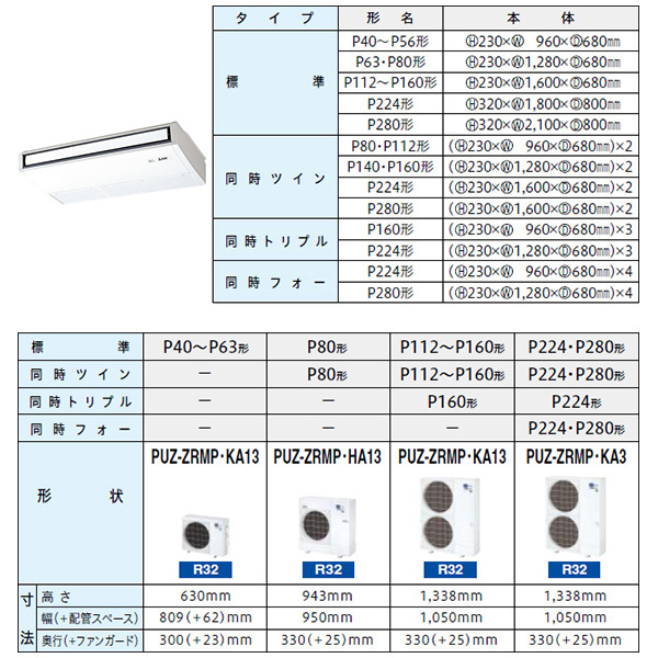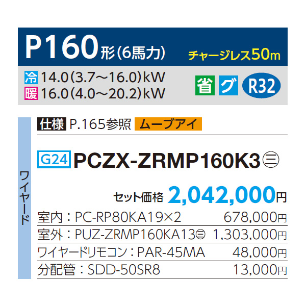 カテゴリ 業務用エアコン 型番 PCZX-ZRMP160K3 定価 2,246,200円 販売価格 税込 504,000円 送料 東京・神奈川全域:無料(一部地域や離島を除く) 詳細 ■メーカー:三菱電機 ■モデル名:2023年モデル ■タイプ名:パッケージエアコン / 天井吊り形1方向 / スリムZR / ツイン(室内機2台×室外機1台) ■能力:6馬力(P160形) /【平米数】94~139㎡ /【坪数】28~42坪 /【畳数】56~84畳 ■電源:三相200V ■室内機:PC-RP80KA19 x2 ■室外機:PUZ-ZRMP160KA13 ●室内機サイズ:高さ230mm×幅1280mm×奥行680mm ●室外機サイズ:高1338mm×幅1050mm×奥行330(+25)mm ■通年エネルギー消費効率:5.7 ■その他機能等 ・ワイヤード ・ムーブアイ ・冷暖自動運転 ・ドライ運転 ・ハイパワー運転 ・風速自動 ・風速ノッチ4 ・暖房プレヒート ・ホットスタート ※記載された情報は商品仕様の一部ですので、詳細はメーカーサイトにてご確認ください。 ※標準取付工事のほか、家電量販店では対応困難な『隠ぺい配管工事』も承ります。