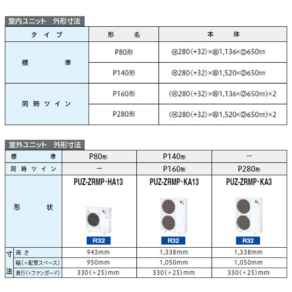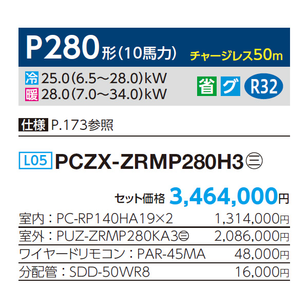 カテゴリ 業務用エアコン 型番 PCZX-ZRMP280H3 定価 3,810,400円 販売価格 税込 854,000円 送料 東京・神奈川全域:無料(一部地域や離島を除く) 詳細 ■メーカー:三菱電機 ■モデル名:2023年モデル ■タイプ名:パッケージエアコン / 厨房用 / スリムZR / ツイン(室内機2台×室外機1台) ■能力:10馬力(P280形) /【平米数】165~243㎡ /【坪数】50~73坪 /【畳数】100~146畳 ■電源:三相200V ■室内機:PC-RP140HA19 x2 ■室外機:PUZ-ZRMP280KA3 ●室内機サイズ:高さ280(+32)mm×幅1520mm×奥行650mm ●室外機サイズ:高1338mm×幅1050mm×奥行330(+25)mm ■通年エネルギー消費効率:4.3 ■その他機能等 ・ワイヤード ・冷暖自動運転 ・ドライ運転 ・ハイパワー運転 ・上下/左右風向切換(手動) ・暖房プレヒート ・ホットスタート ・サーモオフ時霜取り ・パワーシェア運転 ※記載された情報は商品仕様の一部ですので、詳細はメーカーサイトにてご確認ください。 ※標準取付工事のほか、家電量販店では対応困難な『隠ぺい配管工事』も承ります。
