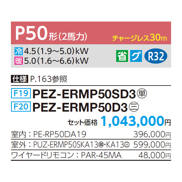 カテゴリ 業務用エアコン 型番 PEZ-ERMP50SD3 / PEZ-ERMP50D3 定価 1,147,300円 販売価格 税込 242,000円 送料 東京・神奈川全域:無料(一部地域や離島を除く) 詳細 ■メーカー:三菱電機 ■モデル名:2023年モデル ■タイプ名:パッケージエアコン / ダクト形 / スリムER / シングル(室内機1台×室外機1台) ■能力:2馬力(P50形) /【平米数】29~43㎡ /【坪数】8~13坪 /【畳数】16~26畳 ■電源:単相200V / 三相200V ■室内機:PE-RP50DA19 ■室外機:PUZ-ERMP50SKA13 / PUZ-ERMP50KA13 ●室内機サイズ:高さ250mm×幅900mm×奥行732mm ●室外機サイズ:高630mm×幅809(+62)mm×奥行300(+23)mm ■通年エネルギー消費効率:4.8 ■その他機能等 ・ワイヤード ・ハイパワー運転 ・冷暖自動運転 ・風速自動 ・ドライ運転 ・パワーシェア運転 ・暖房プレヒート ・風速ノッチ3 ・ホットスタート ※記載された情報は商品仕様の一部ですので、詳細はメーカーサイトにてご確認ください。 ※標準取付工事のほか、家電量販店では対応困難な『隠ぺい配管工事』も承ります。