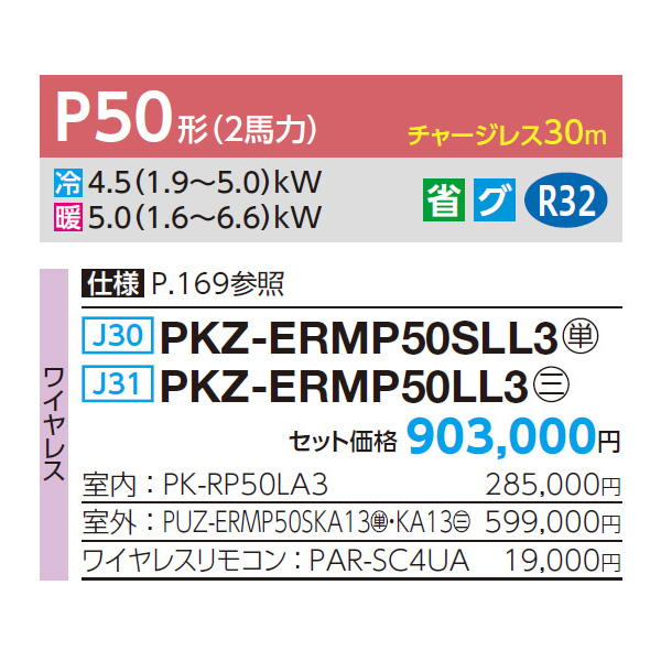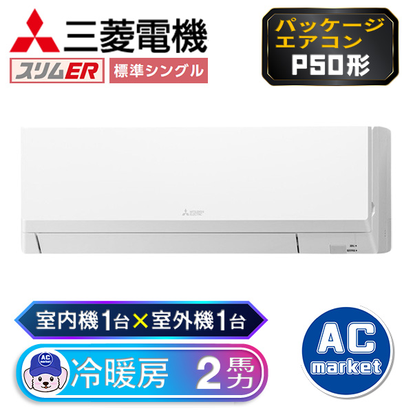 カテゴリ 業務用エアコン 型番 PKZ-ERMP50SLL3 / PKZ-ERMP50LL3 定価 993,300円 販売価格 税込 209,000円 送料 東京・神奈川全域:無料(一部地域や離島を除く) 詳細 ■メーカー:三菱電機 ■モデル名:2023年モデル ■タイプ名:パッケージエアコン / 壁掛け形 / スリムER / シングル(室内機1台×室外機1台) ■能力:2馬力(P50形) /【平米数】29~43㎡ /【坪数】8~13坪 /【畳数】16~26畳 ■電源:単相200V / 三相200V ■室内機:PK-RP50LA3 ■室外機:PUZ-ERMP50SKA13 / PUZ-ERMP50KA13 ●室内機サイズ:高さ299mm×幅898mm×奥行237mm ●室外機サイズ:高630mm×幅809(+62)mm×奥行300(+23)mm ■通年エネルギー消費効率:5.1 ■その他機能等 ・ワイヤレス ・オートスイング ・冷暖自動運転 ・ドライ運転 ・ハイパワー運転 ・風速自動 ・暖房プレヒート ・ホットスタート ・サーモオフ時霜取り ※記載された情報は商品仕様の一部ですので、詳細はメーカーサイトにてご確認ください。 ※標準取付工事のほか、家電量販店では対応困難な『隠ぺい配管工事』も承ります。