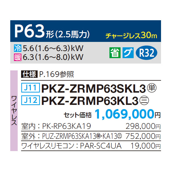 カテゴリ 業務用エアコン 型番 PKZ-ZRMP63SKL3 / PKZ-ZRMP63KL3 定価 1,175,900円 販売価格 税込 264,000円 送料 東京・神奈川全域:無料(一部地域や離島を除く) 詳細 ■メーカー:三菱電機 ■モデル名:2023年モデル ■タイプ名:パッケージエアコン / 壁掛け形 / スリムZR / シングル(室内機1台×室外機1台) ■能力:2.5馬力(P63形) /【平米数】37~55㎡ /【坪数】11~16坪 /【畳数】22~32畳 ■電源:単相200V / 三相200V ■室内機:PK-RP63KA19 ■室外機:PUZ-ZRMP63SKA13 / PUZ-ZRMP63KA13 ●室内機サイズ:高さ365mm×幅1170mm×奥行295mm ●室外機サイズ:高630mm×幅809(+62)mm×奥行300(+23)mm ■通年エネルギー消費効率:5.6 ■その他機能等 ・ワイヤレス ・オートスイング ・冷暖自動運転 ・ドライ運転 ・ハイパワー運転 ・風速自動 ・暖房プレヒート ・ホットスタート ・サーモオフ時霜取り ※記載された情報は商品仕様の一部ですので、詳細はメーカーサイトにてご確認ください。 ※標準取付工事のほか、家電量販店では対応困難な『隠ぺい配管工事』も承ります。