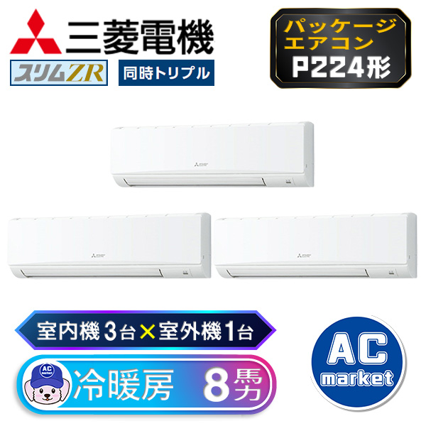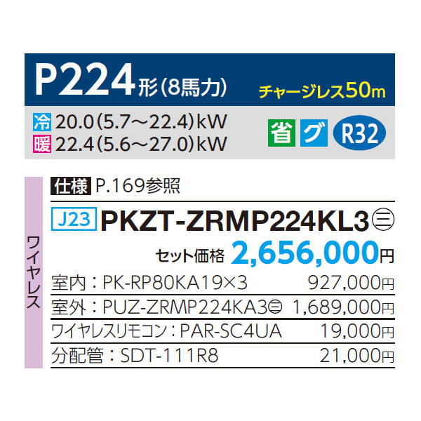 カテゴリ 業務用エアコン 型番 PKZT-ZRMP224KL3 定価 2,921,600円 販売価格 税込 655,000円 送料 東京・神奈川全域:無料(一部地域や離島を除く) 詳細 ■メーカー:三菱電機 ■モデル名:2023年モデル ■タイプ名:パッケージエアコン / 壁掛け形 / スリムZR / トリプル(室内機3台×室外機1台) ■能力:8馬力(P224形) /【平米数】132~195㎡ /【坪数】40~59坪 /【畳数】80~118畳 ■電源:三相200V ■室内機:PK-RP80KA19 x3 ■室外機:PUZ-ZRMP224KA3 ●室内機サイズ:高さ365mm×幅1170mm×奥行295mm ●室外機サイズ:高1338mm×幅1050mm×奥行330(+25)mm ■通年エネルギー消費効率:5.2 ■その他機能等 ・ワイヤレス ・オートスイング ・冷暖自動運転 ・ドライ運転 ・ハイパワー運転 ・風速自動 ・暖房プレヒート ・ホットスタート ・サーモオフ時霜取り ※記載された情報は商品仕様の一部ですので、詳細はメーカーサイトにてご確認ください。 ※標準取付工事のほか、家電量販店では対応困難な『隠ぺい配管工事』も承ります。