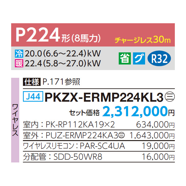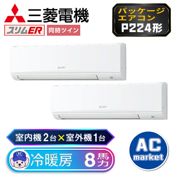 PKZX-ERMP224KL3 三菱電機 ツイン(室内機2台×室外機1台) 業務用エアコン パッケージエアコン 壁掛け形 スリムER ワイヤレス 8馬力 三相200V 2023年モデル