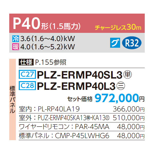 カテゴリ 業務用エアコン 型番 PLZ-ERMP40SL3 / PLZ-ERMP40L3 定価 1,069,200円 販売価格 税込 226,000円 詳細 ■メーカー:三菱電機 ■モデル名:2023年モデル ■タイプ名:パッケージエアコン / 天井埋込形2方向 / スリムER / 標準パネル / シングル(室内機1台×室外機1台) ■能力:1.5馬力(P40形) /【平米数】24~35㎡ /【坪数】7~10坪 /【畳数】14~20畳 ■電源:単相200V / 三相200V ■室内機:PL-RP40LA19 ■室外機:PUZ-ERMP40SKA13 / PUZ-ERMP40KA13 ●室内機サイズ:高さ290mm×幅770mm×奥行650mm ●室外機サイズ:高630mm×幅809(+62)mm×奥行300(+23)mm ■通年エネルギー消費効率:4.9 ■その他機能等 ・ワイヤード ・ムーブアイ ・冷暖自動運転 ・ドライ運転 ・ハイパワー運転 ・風速自動 ・風速ノッチ4 ・風向独立制御 ・ホットスタート ※記載された情報は商品仕様の一部ですので、詳細はメーカーサイトにてご確認ください。 ※標準取付工事のほか、家電量販店では対応困難な『隠ぺい配管工事』も承ります。
