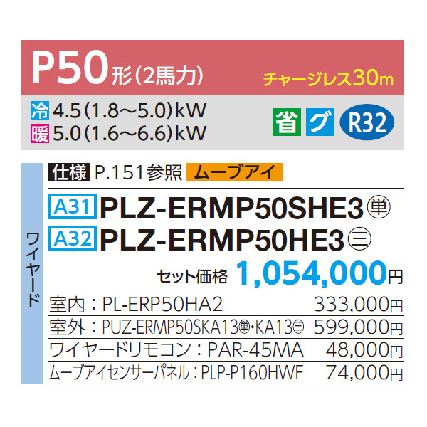 カテゴリ 業務用エアコン 型番 PLZ-ERMP50SHE3 / PLZ-ERMP50HE3 定価 1,159,400円 販売価格 税込 245,000円 詳細 ■メーカー:三菱電機 ■モデル名:2023年モデル ■タイプ名:パッケージエアコン / 天井埋込形4方向 / i-スクエア / スリムER / シングル(室内機1台×室外機1台) ■能力:2馬力(P50形) /【平米数】29~43㎡ /【坪数】8~13坪 /【畳数】16~26畳 ■電源:単相200V / 三相200V ■室内機:PL-ERP50HA2 ■室外機:PUZ-ERMP50SKA13 / PUZ-ERMP50KA13 ●室内機サイズ:高さ258mm×幅840mm×奥行840mm ●室外機サイズ:高630mm×幅809(+62)mm×奥行300(+23)mm ■通年エネルギー消費効率:6.3 ■その他機能等 ・ワイヤード ・人感ムーブアイ ・冷暖自動運転 ・先読み運転 ・ドライ運転 ・ドラフトセーブ ・ウェーブ気流 ・風向独立制御 ・ホットスタート ※記載された情報は商品仕様の一部ですので、詳細はメーカーサイトにてご確認ください。 ※標準取付工事のほか、家電量販店では対応困難な『隠ぺい配管工事』も承ります。
