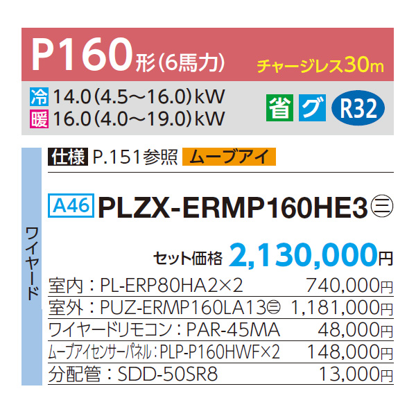 カテゴリ 業務用エアコン 型番 PLZX-ERMP160HE3 定価 2,343,000円 販売価格 税込 493,000円 詳細 ■メーカー:三菱電機 ■モデル名:2023年モデル ■タイプ名:パッケージエアコン / 天井埋込形4方向 / i-スクエア / スリムER / ツイン(室内機2台×室外機1台) ■能力:6馬力(P160形) /【平米数】94~139㎡ /【坪数】28~42坪 /【畳数】56~84畳 ■電源:三相200V ■室内機:PL-ERP80HA2 x2 ■室外機:PUZ-ERMP160LA13 ●室内機サイズ:高さ258mm×幅840mm×奥行840mm ●室外機サイズ:高1018mm×幅950mm×奥行330(+25)mm ■通年エネルギー消費効率:5.7 ■その他機能等 ・ワイヤード ・人感ムーブアイ ・冷暖自動運転 ・先読み運転 ・ドライ運転 ・ドラフトセーブ ・ウェーブ気流 ・風向独立制御 ・ホットスタート ※記載された情報は商品仕様の一部ですので、詳細はメーカーサイトにてご確認ください。 ※標準取付工事のほか、家電量販店では対応困難な『隠ぺい配管工事』も承ります。