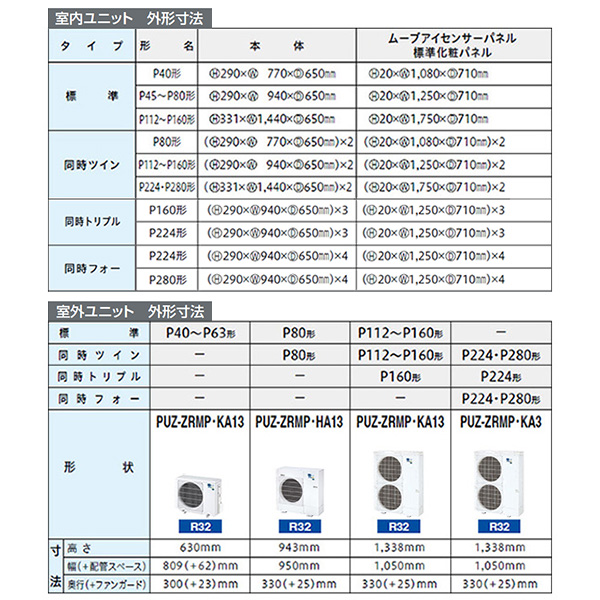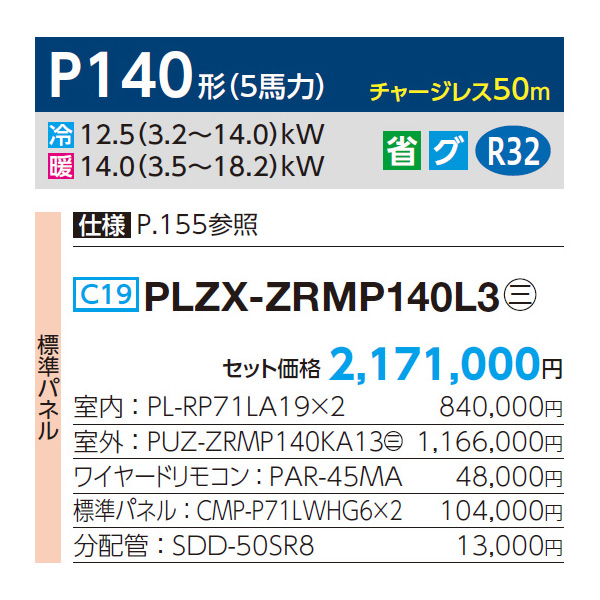 カテゴリ 業務用エアコン 型番 PLZX-ZRMP140L3 定価 2,388,100円 販売価格 税込 536,000円 詳細 ■メーカー:三菱電機 ■モデル名:2023年モデル ■タイプ名:パッケージエアコン / 天井埋込形2方向 / スリムZR / 標準パネル / ツイン(室内機2台×室外機1台) ■能力:5馬力(P140形) /【平米数】82~122㎡ /【坪数】24~36坪 /【畳数】48~72畳 ■電源:三相200V ■室内機:PL-RP71LA19 x2 ■室外機:PUZ-ZRMP140KA13 ●室内機サイズ:高さ290mm×幅940mm×奥行650mm ●室外機サイズ:高1338mm×幅1050mm×奥行330(+25)mm ■通年エネルギー消費効率:5.6 ■その他機能等 ・ワイヤード ・ムーブアイmirA.I. ・冷暖自動運転 ・先読み運転 ・ドライ運転 ・風速自動 ・ハイパワー運転 ・風向独立制御 ・ホットスタート ※記載された情報は商品仕様の一部ですので、詳細はメーカーサイトにてご確認ください。 ※標準取付工事のほか、家電量販店では対応困難な『隠ぺい配管工事』も承ります。