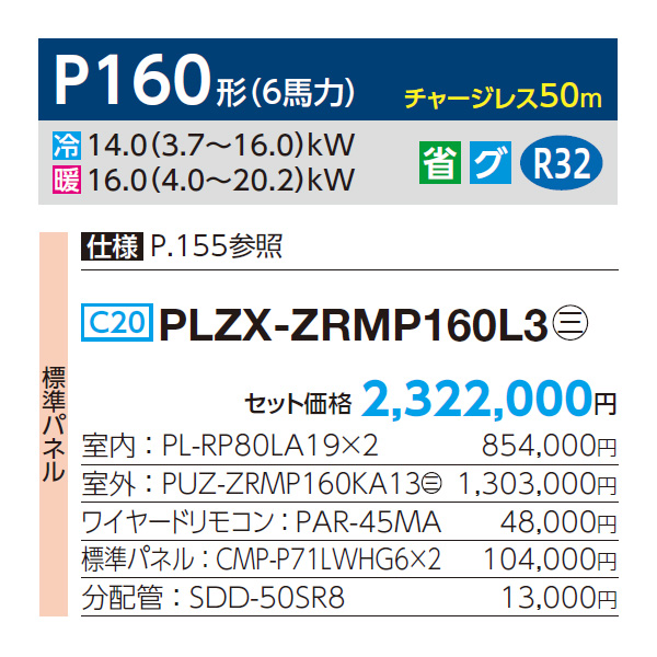 カテゴリ 業務用エアコン 型番 PLZX-ZRMP160L3 定価 2,554,200円 販売価格 税込 574,000円 詳細 ■メーカー:三菱電機 ■モデル名:2023年モデル ■タイプ名:パッケージエアコン / 天井埋込形2方向 / スリムZR / 標準パネル / ツイン(室内機2台×室外機1台) ■能力:6馬力(P160形) /【平米数】94~139㎡ /【坪数】28~42坪 /【畳数】56~84畳 ■電源:三相200V ■室内機:PL-RP80LA19 x2 ■室外機:PUZ-ZRMP160KA13 ●室内機サイズ:高さ290mm×幅940mm×奥行650mm ●室外機サイズ:高1338mm×幅1050mm×奥行330(+25)mm ■通年エネルギー消費効率:5.2 ■その他機能等 ・ワイヤード ・ムーブアイmirA.I. ・冷暖自動運転 ・先読み運転 ・ドライ運転 ・風速自動 ・ハイパワー運転 ・風向独立制御 ・ホットスタート ※記載された情報は商品仕様の一部ですので、詳細はメーカーサイトにてご確認ください。 ※標準取付工事のほか、家電量販店では対応困難な『隠ぺい配管工事』も承ります。