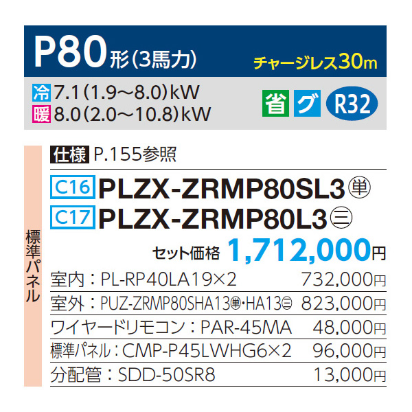 カテゴリ 業務用エアコン 型番 PLZX-ZRMP80SL3 / PLZX-ZRMP80L3 定価 1,883,200円 販売価格 税込 423,000円 詳細 ■メーカー:三菱電機 ■モデル名:2023年モデル ■タイプ名:パッケージエアコン / 天井埋込形2方向 / スリムZR / 標準パネル / ツイン(室内機2台×室外機1台) ■能力:3馬力(P80形) /【平米数】47~70㎡ /【坪数】14~21坪 /【畳数】28~42畳 ■電源:単相200V / 三相200V ■室内機:PL-RP40LA19 x2 ■室外機:PUZ-ZRMP80SHA13 / PUZ-ZRMP80HA13 ●室内機サイズ:高さ290mm×幅770mm×奥行650mm ●室外機サイズ:高943mm×幅950mm×奥行330(+25)mm ■通年エネルギー消費効率:5.3 ■その他機能等 ・ワイヤード ・ムーブアイmirA.I. ・冷暖自動運転 ・先読み運転 ・ドライ運転 ・風速自動 ・ハイパワー運転 ・風向独立制御 ・ホットスタート ※記載された情報は商品仕様の一部ですので、詳細はメーカーサイトにてご確認ください。 ※標準取付工事のほか、家電量販店では対応困難な『隠ぺい配管工事』も承ります。