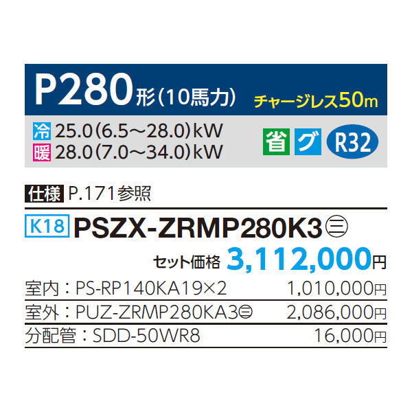 カテゴリ 業務用エアコン 型番 PSZX-ZRMP280K3 定価 3,423,200円 販売価格 税込 768,000円 送料 東京・神奈川全域:無料(一部地域や離島を除く) 詳細 ■メーカー:三菱電機 ■モデル名:2023年モデル ■タイプ名:パッケージエアコン / 床置き形 / スリムZR / ツイン(室内機2台×室外機1台) ■能力:10馬力(P280形) /【平米数】165~243㎡ /【坪数】50~73坪 /【畳数】100~146畳 ■電源:三相200V ■室内機:PS-RP140KA19 x2 ■室外機:PUZ-ZRMP280KA3 ●室内機サイズ:高さ1900mm×幅600mm×奥行360mm ●室外機サイズ:高1338mm×幅1050mm×奥行330(+25)mm ■通年エネルギー消費効率:4.7 ■その他機能等 ・ワイヤード ・冷暖自動運転 ・ドライ運転 ・ハイパワー運転 ・風速自動 ・暖房プレヒート ・ホットスタート ・サーモオフ時霜取り ・パワーシェア運転 ※記載された情報は商品仕様の一部ですので、詳細はメーカーサイトにてご確認ください。 ※標準取付工事のほか、家電量販店では対応困難な『隠ぺい配管工事』も承ります。