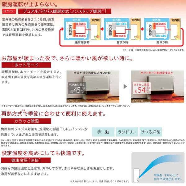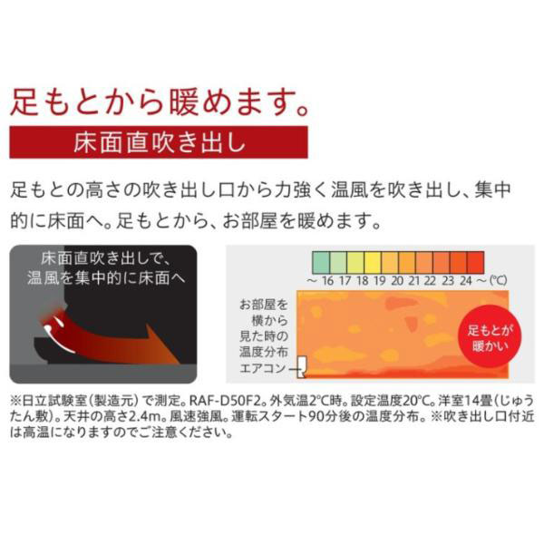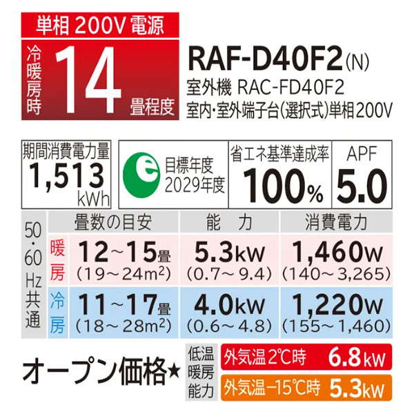 カテゴリ ハウジングエアコン 型番 RAF-D40F2 定価 オープン価格 販売価格 税込 324,000円 詳細 ■メーカー:日立 ■シリーズ名:白くまくん メガ暖 FDシリーズ ■タイプ名:床置き形 ■適用畳数:14畳用 ■カラー:ロゼシャンパン ■電源:単相200V ■室内機:RAF-D40F2-N ■室外機:RAC-FD40F2 ●室内機サイズ:高さ59.5mm×幅750mm×奥行230mm ●室外機サイズ:高さ720mm×幅792(+94)mm×奥行299(+66)mm ■期間消費電力量(年間):1513kWh ■その他機能等 ・寒冷地仕様 ・空清フィルター ・エアコン内部クリーン(ワンタッチ) ・イオンミストできれい ・デュアルバイパス暖房 ・みはって霜取りS ・カラッと除湿(手動/ランドリー/けつろ制御) ・凍結防止ヒーター ・上下スイング / 左右スイング ※記載された情報は商品仕様の一部ですので、詳細はメーカーサイトにてご確認ください。 ※標準取付工事のほか、家電量販店では対応困難な『隠ぺい配管工事』も承ります。