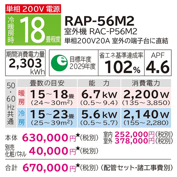 カテゴリ ハウジングエアコン 型番 RAP-56M2 定価 670,000円 販売価格 税込 238,000円 送料 東京・神奈川全域:無料(一部地域や離島を除く) 詳細 ■メーカー:日立 ■モデル名:2023年モデル ■タイプ名:天井埋込形1方向 ■シリーズ名:Pシリーズ ■適用畳数:18畳用 ■電源:単相200V ■室内機:RAP-56M2 ■室外機:RAC-P56M2 ●室内機サイズ:高さ185mm×幅998mm×奥行378mm ●室外機サイズ:高さ669mm×幅819(+97)mm×奥行319(+68)mm ■期間消費電力量(年間):2303kWh ■その他機能等 ・熱交換器自動お掃除[凍結洗浄Light] ・エアコン内部クリーン ・みはって霜取りS ・ソフト除湿 ・PAM制御 ・スイング 上下 / 左右 ・おすすめ設定温度 ・みはっておやすみ ・H-LINK / カードキー対応 ※記載された情報は商品仕様の一部ですので、詳細はメーカーサイトにてご確認ください。 ※標準取付工事のほか、家電量販店では対応困難な『隠ぺい配管工事』も承ります。