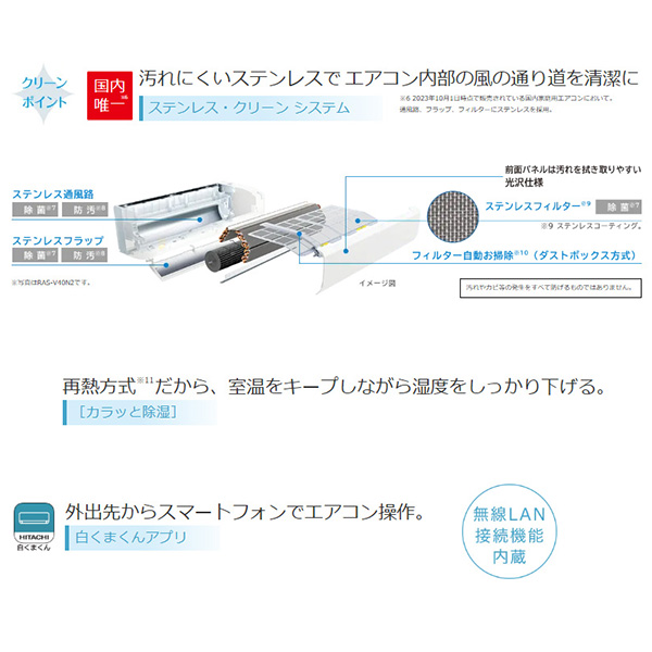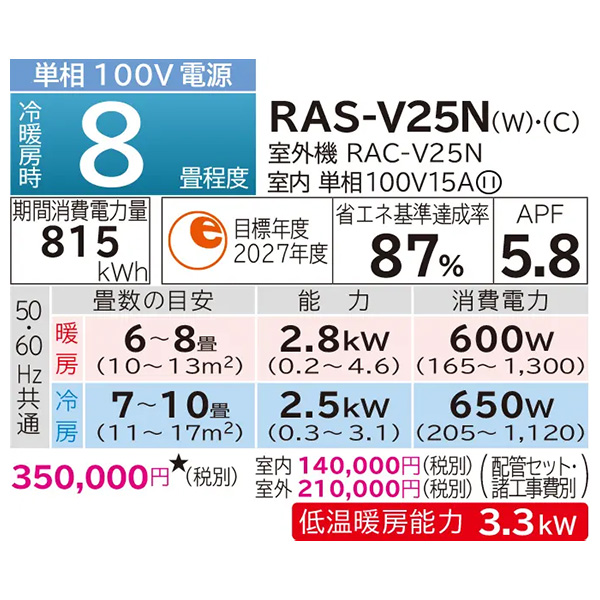 カテゴリ ルームエアコン 型番 RAS-V25N-C 定価 350,000円 販売価格 税込 141,000円 送料 東京・神奈川全域:無料(一部地域や離島を除く) 詳細 ■メーカー:日立 ■モデル名:2023年モデル ■シリーズ名:白くまくん Vシリーズ ■適用畳数:8畳用 ■カラー:シャインベージュ ■電源:単相100V ■室内機:RAS-V25N ■室外機:RAC-V25N ●室内機サイズ:高さ248mm×幅798mm×奥行340mm ●室外機サイズ:高さ570mm×幅750(+60)mm×奥行288(+56)mm ■期間消費電力量(年間):815kWh ■その他機能等 ・熱交換器自動お掃除[凍結洗浄Light] ・室外機 熱交換器自動お掃除[凍結洗浄] ・自動お掃除 フィルター / ファンお掃除ロボ ・カラッと除湿:手動カラッと除湿 / パワフル除湿 ・カビバスター ・エアコン内部クリーン(内部乾燥) ・日射センサー ・涼快 ・みはって霜取りS ※記載された情報は商品仕様の一部ですので、詳細はメーカーサイトにてご確認ください。 ※標準取付工事のほか、家電量販店では対応困難な『隠ぺい配管工事』も承ります。