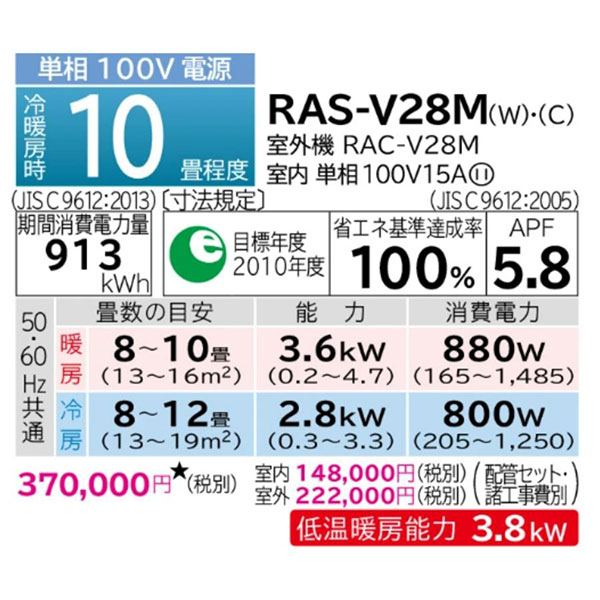カテゴリ ルームエアコン 型番 RAS-V28M-W 定価 370,000円 販売価格 税込 160,000円 送料 東京・神奈川全域:無料(一部地域や離島を除く) 詳細 ■メーカー:日立 ■モデル名:2022年モデル ■シリーズ名:白くまくん Vシリーズ ■適用畳数:10畳用 ■カラー:ホワイト ■電源:単相100V ■室内機:RAS-V28M-W ■室外機:RAC-V28M ●室内機サイズ:幅798mm×高さ248mm×奥行340mm ●室外機サイズ:幅750(+60)mm×高さ570mm×奥行288(+56)mm ■期間消費電力量(年間):913kWh ■その他機能等 ・凍結洗浄 ・ファン自動お掃除 ・ステンレスフィルター ・ステンレス通風路 ・ステンレスフラップ ・フィルター自動お掃除 ・カビバスター ・エアコン内部クリーン ・プレシーズンお手入れ ※記載された情報は商品仕様の一部ですので、詳細はメーカーサイトにてご確認ください。 ※標準取付工事のほか、家電量販店では対応困難な『隠ぺい配管工事』も承ります。