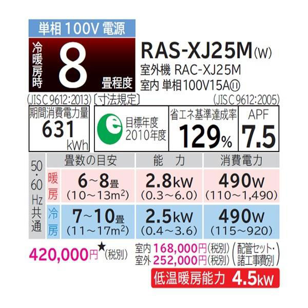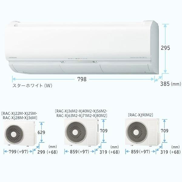 カテゴリ ルームエアコン 型番 RAS-XJ25M-W 定価 420,000円 販売価格 税込 233,000円 送料 東京・神奈川全域:無料(一部地域や離島を除く) 詳細 ■メーカー:日立 ■モデル名:2022年モデル ■シリーズ名:白くまくん XJシリーズ ■適用畳数:8畳用 ■カラー:スターホワイト ■電源:単相100V ■室内機:RAS-XJ25M-W ■室外機:RAC-XJ25M ●室内機サイズ:高295×幅798×奥行3855mm ●室外機サイズ:高629×幅799(+97)×奥行299(+68)mm ■期間消費電力量(年間):631kWh ■その他機能等 ・熱交換器自動お掃除[凍結洗浄]室外機 ・排水トレー自動お掃除[凍結洗浄] ・カビバスター ・銅合金ウイルス抑制 ・ビッグ&ウェーブファン ・風よけエリアセレクト ・スピード暖房 ・みはって霜取りS ・プレミアム天井気流 ※記載された情報は商品仕様の一部ですので、詳細はメーカーサイトにてご確認ください。 ※標準取付工事のほか、家電量販店では対応困難な『隠ぺい配管工事』も承ります。