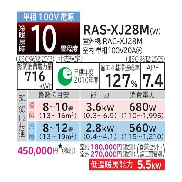 カテゴリ ルームエアコン 型番 RAS-XJ28M-W 定価 450,000円 販売価格 税込 250,000円 送料 東京・神奈川全域:無料(一部地域や離島を除く) 詳細 ■メーカー:日立 ■モデル名:2022年モデル ■シリーズ名:白くまくん XJシリーズ ■適用畳数:10畳用 ■カラー:スターホワイト ■電源:単相100V ■室内機:RAS-XJ28M-W ■室外機:RAC-XJ28M ●室内機サイズ:高295×幅798×奥行3855mm ●室外機サイズ:高629×幅799(+97)×奥行299(+68)mm ■期間消費電力量(年間):716kWh ■その他機能等 ・熱交換器自動お掃除[凍結洗浄]室外機 ・排水トレー自動お掃除[凍結洗浄] ・カビバスター ・銅合金ウイルス抑制 ・ビッグ&ウェーブファン ・風よけエリアセレクト ・スピード暖房 ・みはって霜取りS ・プレミアム天井気流 ※記載された情報は商品仕様の一部ですので、詳細はメーカーサイトにてご確認ください。 ※標準取付工事のほか、家電量販店では対応困難な『隠ぺい配管工事』も承ります。