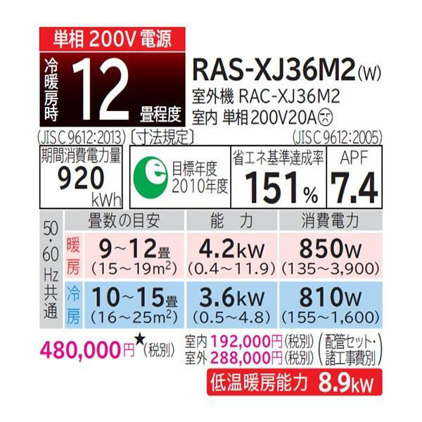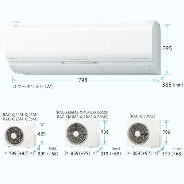カテゴリ ルームエアコン 型番 RAS-XJ36M2-W 定価 480,000円 販売価格 税込 267,000円 送料 東京・神奈川全域:無料(一部地域や離島を除く) 詳細 ■メーカー:日立 ■モデル名:2022年モデル ■シリーズ名:白くまくん XJシリーズ ■適用畳数:12畳用 ■カラー:スターホワイト ■電源:単相200V ■室内機:RAS-XJ36M2-W ■室外機:RAC-XJ36M2 ●室内機サイズ:高295×幅798×奥行3855mm ●室外機サイズ:高709×幅859(+97)×奥行319(+68)mm ■期間消費電力量(年間):920kWh ■その他機能等 ・熱交換器自動お掃除[凍結洗浄]室外機 ・排水トレー自動お掃除[凍結洗浄] ・カビバスター ・銅合金ウイルス抑制 ・ビッグ&ウェーブファン ・風よけエリアセレクト ・スピード暖房 ・みはって霜取りS ・プレミアム天井気流 ※記載された情報は商品仕様の一部ですので、詳細はメーカーサイトにてご確認ください。 ※標準取付工事のほか、家電量販店では対応困難な『隠ぺい配管工事』も承ります。