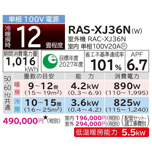 カテゴリ ルームエアコン 型番 RAS-XJ36N-W 定価 490,000円 販売価格 税込 250,000円 送料 東京・神奈川全域:無料(一部地域や離島を除く) 詳細 ■メーカー:日立 ■モデル名:2023年モデル ■シリーズ名:白くまくん XJシリーズ ■適用畳数:12畳用 ■カラー:スターホワイト ■電源:単相100V ■室内機:RAS-XJ36N ■室外機:RAC-XJ36N ●室内機サイズ:高さ295mm×幅798mm×奥行385mm ●室外機サイズ:高さ629mm×幅799(+97)mm×奥行299(+68)mm ■期間消費電力量(年間):1016kWh ■その他機能等 ・Premiumプラズマ空清 ・熱交換器自動お掃除[凍結洗浄 除菌ヒートプラス] ・室外機 熱交換器自動お掃除[凍結洗浄] ・自動お掃除 フィルター / ファンお掃除ロボ ・カラッと除湿:自動カラッと除湿 ・カビバスター ・風よけエリアセレクト ・涼快 ・みはって霜取りS ※記載された情報は商品仕様の一部ですので、詳細はメーカーサイトにてご確認ください。 ※標準取付工事のほか、家電量販店では対応困難な『隠ぺい配管工事』も承ります。