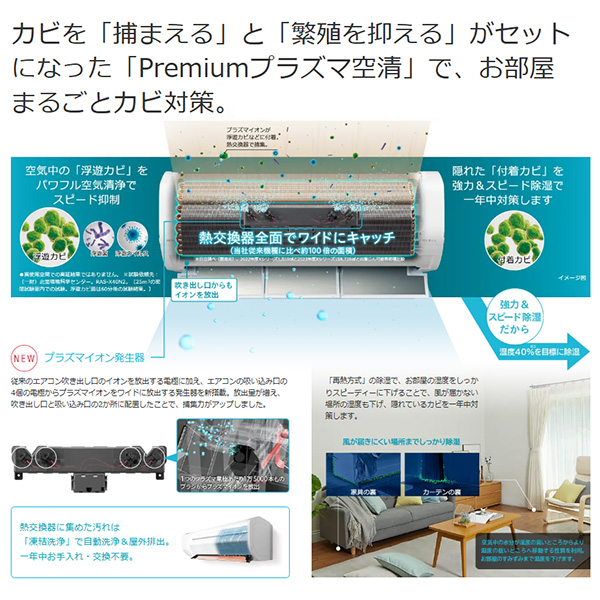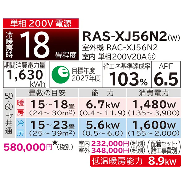 カテゴリ ルームエアコン 型番 RAS-XJ56N2-W 定価 580,000円 販売価格 税込 295,000円 送料 東京・神奈川全域:無料(一部地域や離島を除く) 詳細 ■メーカー:日立 ■モデル名:2023年モデル ■シリーズ名:白くまくん XJシリーズ ■適用畳数:18畳用 ■カラー:スターホワイト ■電源:単相200V ■室内機:RAS-XJ56N2 ■室外機:RAC-XJ56N2 ●室内機サイズ:高さ295mm×幅798mm×奥行385mm ●室外機サイズ:高さ709mm×幅859(+97)mm×奥行319(+68)mm ■期間消費電力量(年間):1630kWh ■その他機能等 ・Premiumプラズマ空清 ・熱交換器自動お掃除[凍結洗浄 除菌ヒートプラス] ・室外機 熱交換器自動お掃除[凍結洗浄] ・自動お掃除 フィルター / ファンお掃除ロボ ・カラッと除湿:自動カラッと除湿 ・カビバスター ・風よけエリアセレクト ・涼快 ・みはって霜取りS ※記載された情報は商品仕様の一部ですので、詳細はメーカーサイトにてご確認ください。 ※標準取付工事のほか、家電量販店では対応困難な『隠ぺい配管工事』も承ります。