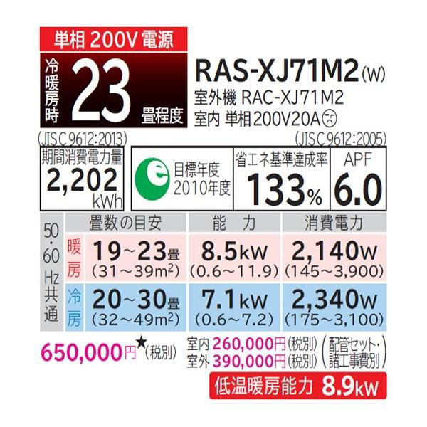 カテゴリ ルームエアコン 型番 RAS-XJ71M2-W 定価 650,000円 販売価格 税込 361,000円 送料 東京・神奈川全域:無料(一部地域や離島を除く) 詳細 ■メーカー:日立 ■モデル名:2022年モデル ■シリーズ名:白くまくん XJシリーズ ■適用畳数:23畳用 ■カラー:スターホワイト ■電源:単相200V ■室内機:RAS-XJ71M2-W ■室外機:RAC-XJ71M2 ●室内機サイズ:高295×幅798×奥行3855mm ●室外機サイズ:高709×幅859(+97)×奥行319(+68)mm ■期間消費電力量(年間):2202kWh ■その他機能等 ・熱交換器自動お掃除[凍結洗浄]室外機 ・排水トレー自動お掃除[凍結洗浄] ・カビバスター ・銅合金ウイルス抑制 ・ビッグ&ウェーブファン ・風よけエリアセレクト ・スピード暖房 ・みはって霜取りS ・プレミアム天井気流 ※記載された情報は商品仕様の一部ですので、詳細はメーカーサイトにてご確認ください。 ※標準取付工事のほか、家電量販店では対応困難な『隠ぺい配管工事』も承ります。