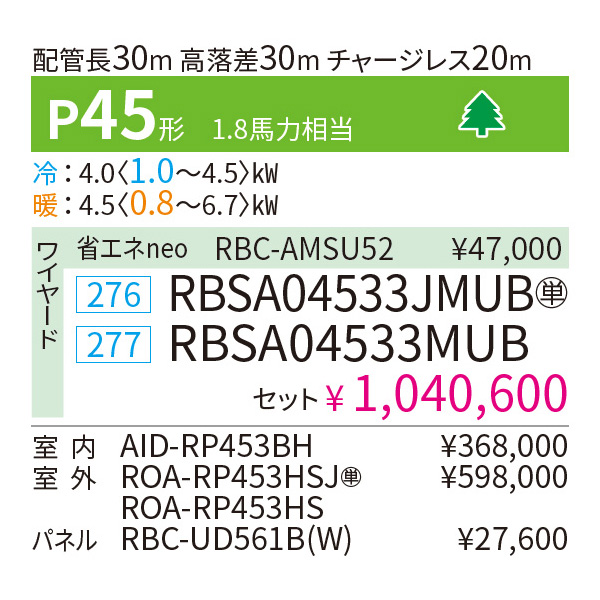 カテゴリ 業務用エアコン 型番 RBSA04533MUB / RBSA04533JMUB 定価 1,144,660円 販売価格 税込 241,000円 詳細 ■メーカー:東芝 ■モデル名:2023年モデル ■タイプ名:パッケージエアコン / ビルトイン / シングル(室内機1台×室外機1台) / スーパーパワーエコゴールド ■能力:1.8馬力(P45形) /【平米数】26~39㎡ /【坪数】7~11坪 /【畳数】14~22畳 ■電源:三相200V / 単相200V ■室内機:AID-RP453BH ■室外機:ROA-RP453HS / ROA-RP453HSJ ●室内機サイズ:高さ275mm×幅700mm×奥行925mm ●室外機サイズ:高さ550mm×幅780(+69)mm×奥行290mm ■通年エネルギー消費効率:4.7 ■その他機能等 ・ワイヤード ・ドライ運転 ・冷暖自動運転 ・ホットスタート ・風量切換(5段階) ・スマート節約運転 ・除霜連携 ・ドレンアップ機能 ・全熱交換ユニット連動 ※記載された情報は商品仕様の一部ですので、詳細はメーカーサイトにてご確認ください。 ※標準取付工事のほか、家電量販店では対応困難な『隠ぺい配管工事』も承ります。
