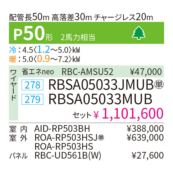 カテゴリ 業務用エアコン 型番 RBSA05033MUB / RBSA05033JMUB 定価 1,211,760円 販売価格 税込 256,000円 詳細 ■メーカー:東芝 ■モデル名:2023年モデル ■タイプ名:パッケージエアコン / ビルトイン / シングル(室内機1台×室外機1台) / スーパーパワーエコゴールド ■能力:2馬力(P50形) /【平米数】29~43㎡ /【坪数】8~13坪 /【畳数】16~26畳 ■電源:三相200V / 単相200V ■室内機:AID-RP503BH ■室外機:ROA-RP503HS / ROA-RP503HSJ ●室内機サイズ:高さ275mm×幅700mm×奥行925mm ●室外機サイズ:高さ550mm×幅780(+69)mm×奥行290mm ■通年エネルギー消費効率:4.7 ■その他機能等 ・ワイヤード ・ドライ運転 ・冷暖自動運転 ・ホットスタート ・風量切換(5段階) ・スマート節約運転 ・除霜連携 ・ドレンアップ機能 ・全熱交換ユニット連動 ※記載された情報は商品仕様の一部ですので、詳細はメーカーサイトにてご確認ください。 ※標準取付工事のほか、家電量販店では対応困難な『隠ぺい配管工事』も承ります。