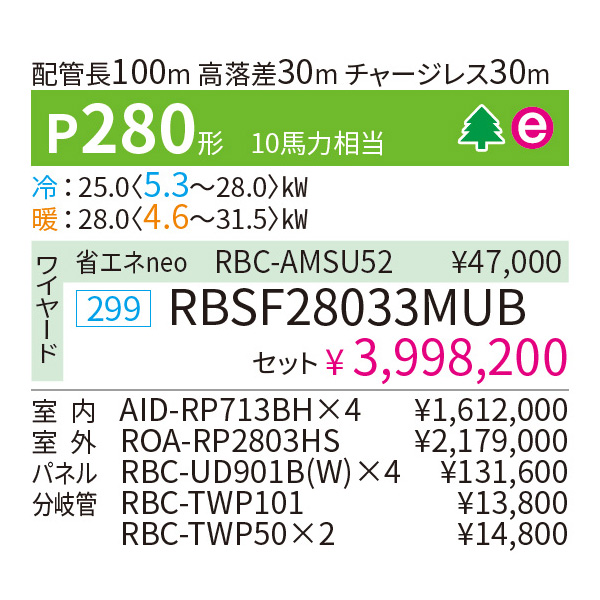 カテゴリ 業務用エアコン 型番 RBSF28033MUB 定価 4,398,020円 販売価格 税込 924,000円 詳細 ■メーカー:東芝 ■モデル名:2023年モデル ■タイプ名:パッケージエアコン / ビルトイン / ダブルツイン(室内機4台×室外機1台) / スーパーパワーエコゴールド ■能力:10馬力(P280形) /【平米数】165~243㎡ /【坪数】50~73坪 /【畳数】100~146畳 ■電源:三相200V ■室内機:AID-RP713BH x4 ■室外機:ROA-RP2803HS x1 ●室内機サイズ:高さ275mm×幅1000mm×奥行925mm ●室外機サイズ:高さ1550mm×幅1010mm×奥行370mm ■通年エネルギー消費効率:4.6 ■その他機能等 ・ワイヤード ・ドライ運転 ・冷暖自動運転 ・ホットスタート ・風量切換(5段階) ・スマート節約運転 ・除霜連携 ・ドレンアップ機能 ・全熱交換ユニット連動 ※記載された情報は商品仕様の一部ですので、詳細はメーカーサイトにてご確認ください。 ※標準取付工事のほか、家電量販店では対応困難な『隠ぺい配管工事』も承ります。