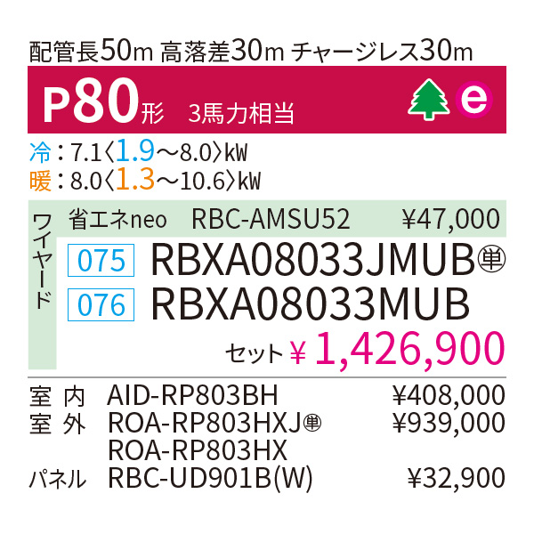 カテゴリ 業務用エアコン 型番 RBXA08033MUB / RBXA08033JMUB 定価 1,569,590円 販売価格 税込 418,000円 詳細 ■メーカー:東芝 ■モデル名:2023年モデル ■タイプ名:パッケージエアコン / ビルトイン / シングル(室内機1台×室外機1台) / ウルトラパワーエコ ■能力:3馬力(P80形) /【平米数】47~70㎡ /【坪数】14~21坪 /【畳数】28~42畳 ■電源:三相200V / 単相200V ■室内機:AID-RP803BH ■室外機:ROA-RP803HX / ROA-RP803HXJ ●室内機サイズ:高さ275mm×幅1000mm×奥行925mm ●室外機サイズ:高さ1050mm×幅1010mm×奥行370mm ■通年エネルギー消費効率:5.6 ■その他機能等 ・ワイヤード ・ドライ運転 ・冷暖自動運転 ・ホットスタート ・風量切換(5段階) ・スマート節約運転 ・除霜連携 ・ドレンアップ機能 ・全熱交換ユニット連動 ※記載された情報は商品仕様の一部ですので、詳細はメーカーサイトにてご確認ください。 ※標準取付工事のほか、家電量販店では対応困難な『隠ぺい配管工事』も承ります。
